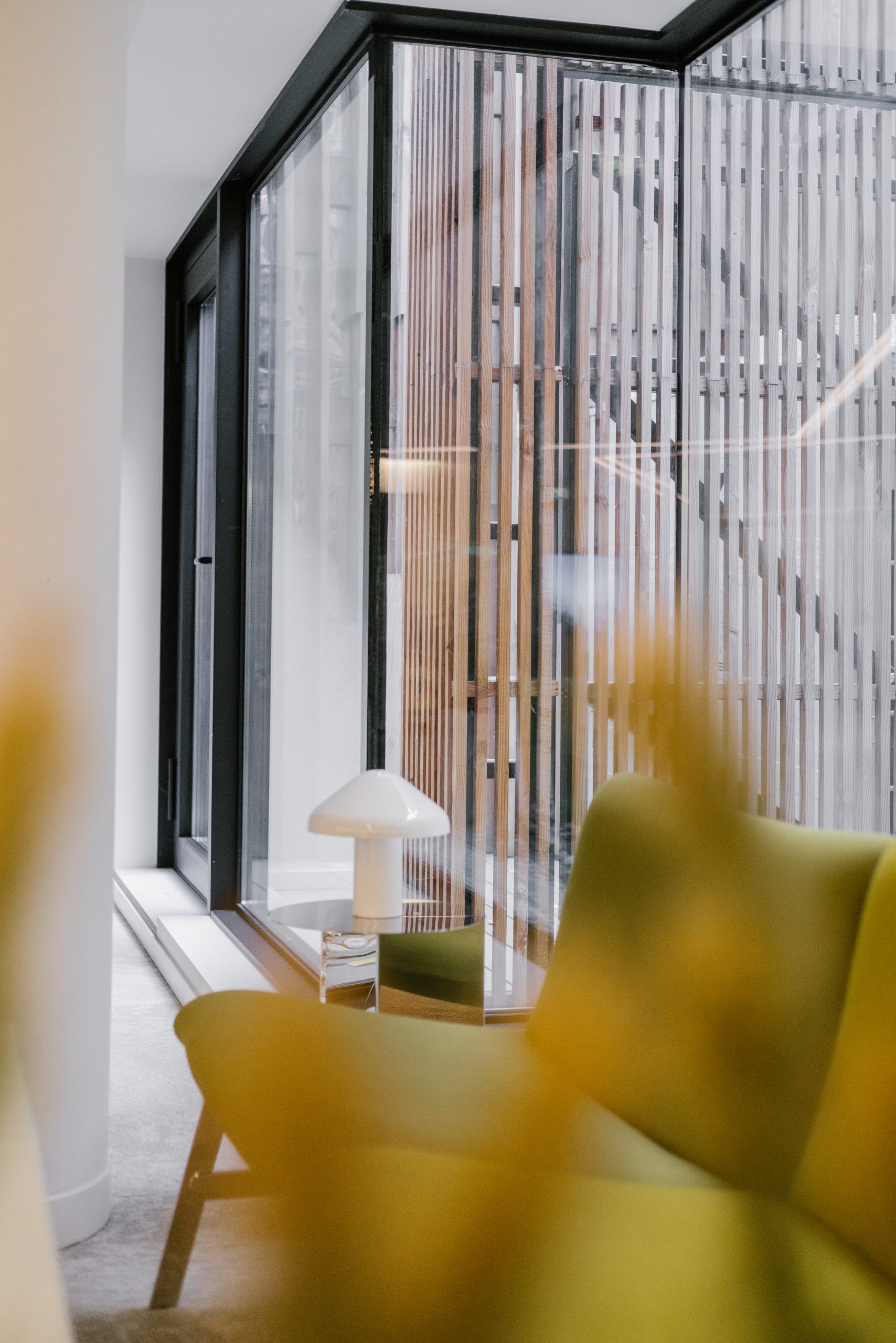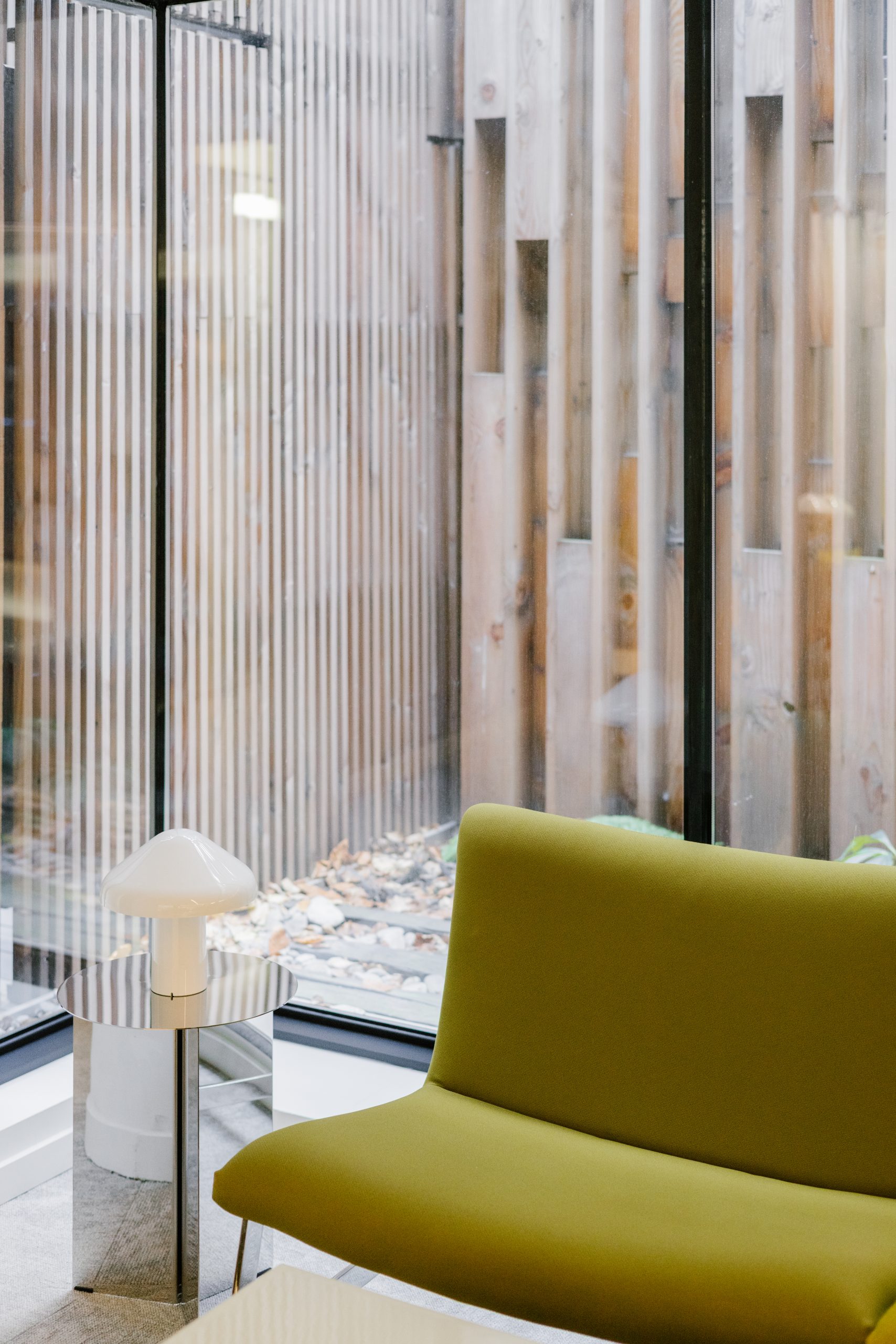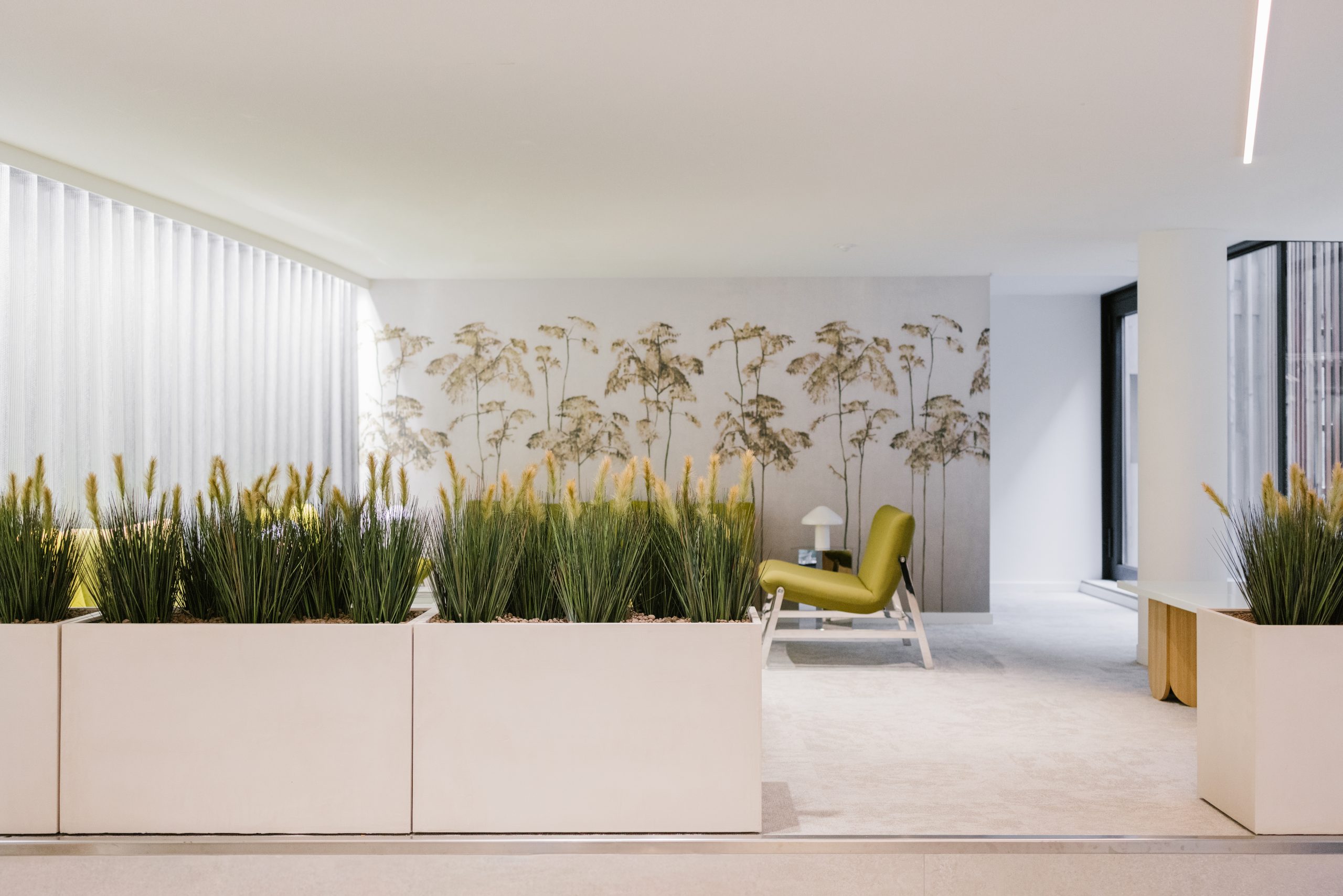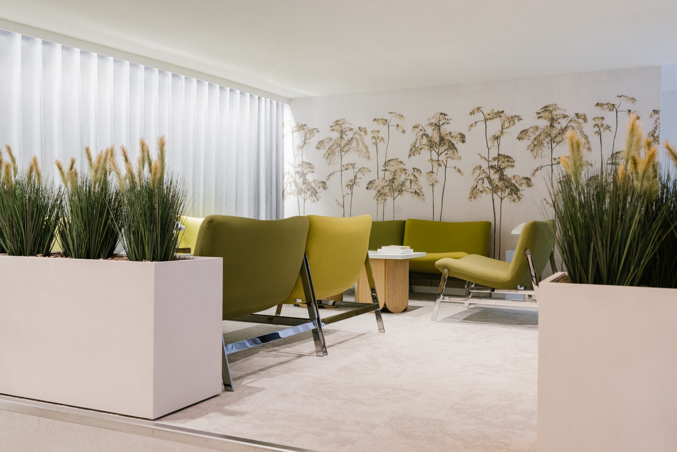 Interior design of a lounge area next to the reception of an office building in Brussels.