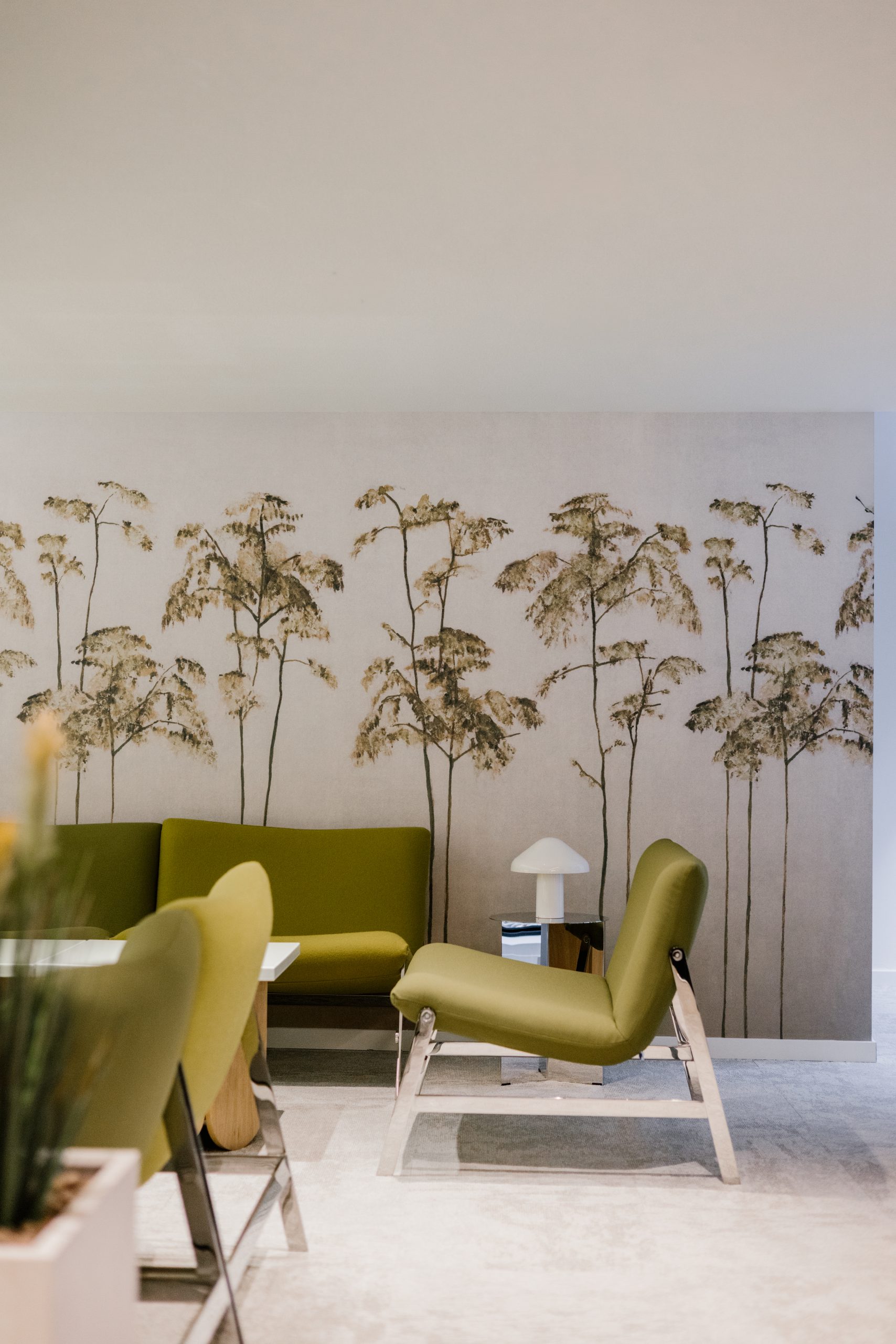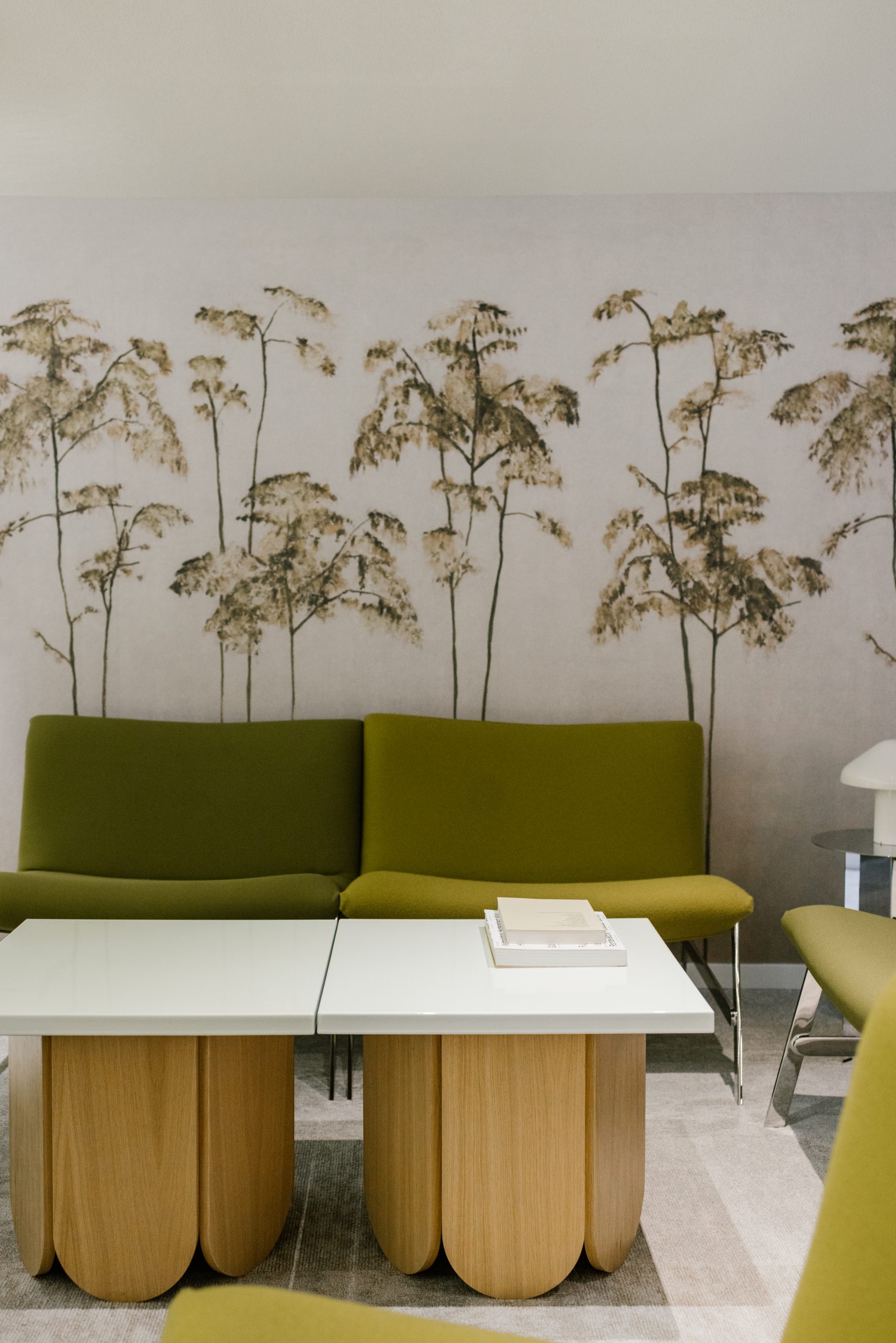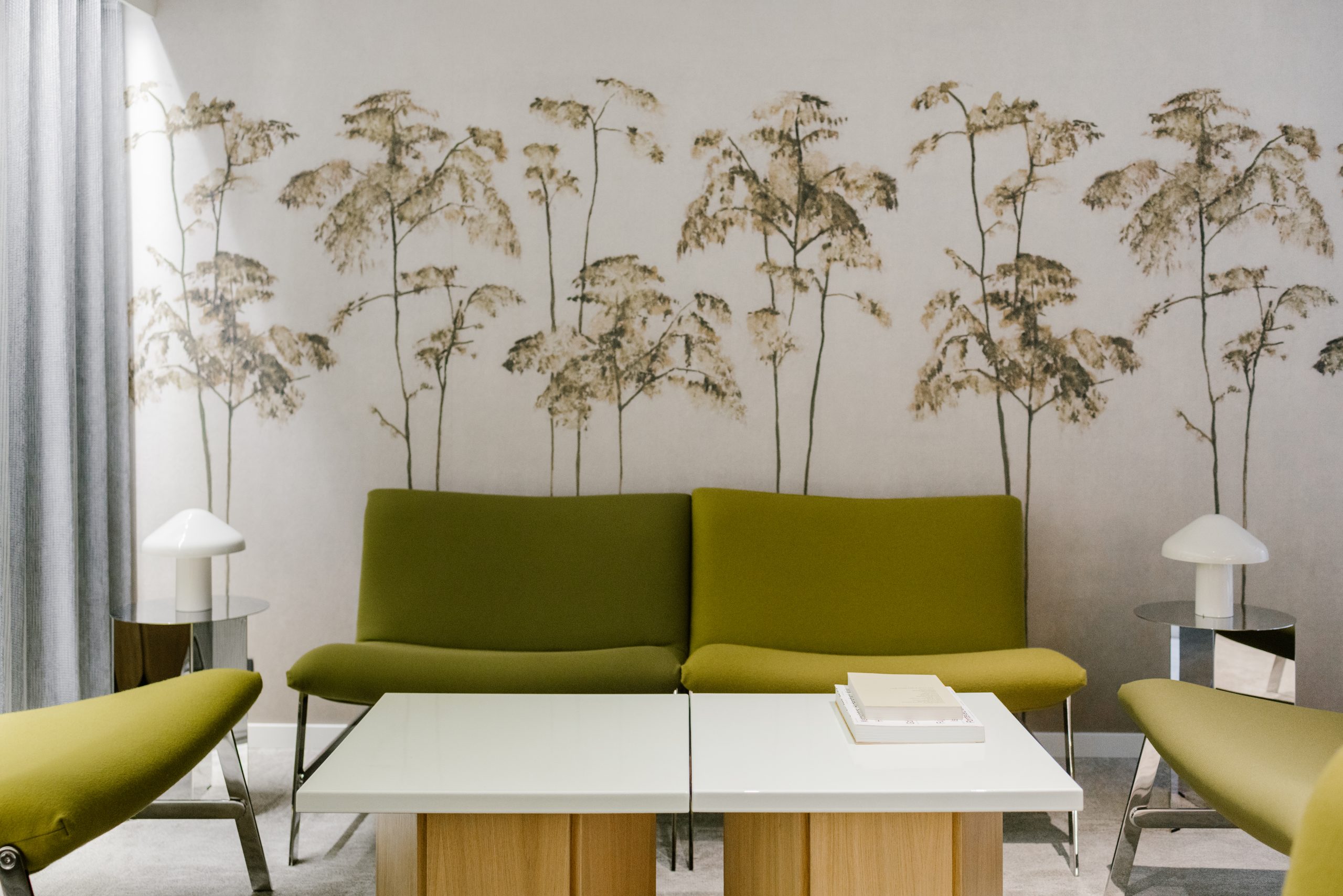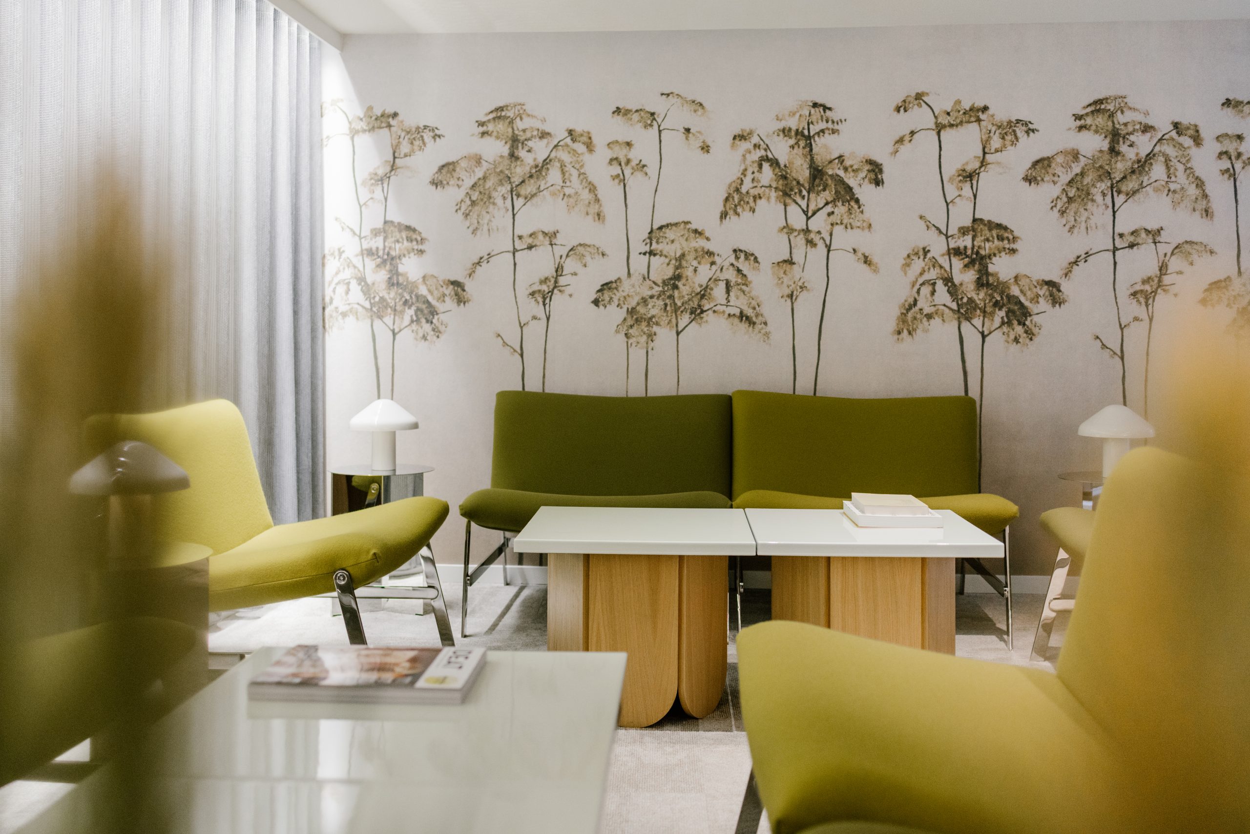 Des fauteuils sans accoudoirs et des tables basses sur mesure peuvent être agencés de différentes manières, offrant ainsi une grande flexibilité d'aménagement. En arrière-plan, un papier peint panoramique naturel enveloppe le salon avec luxuriance.