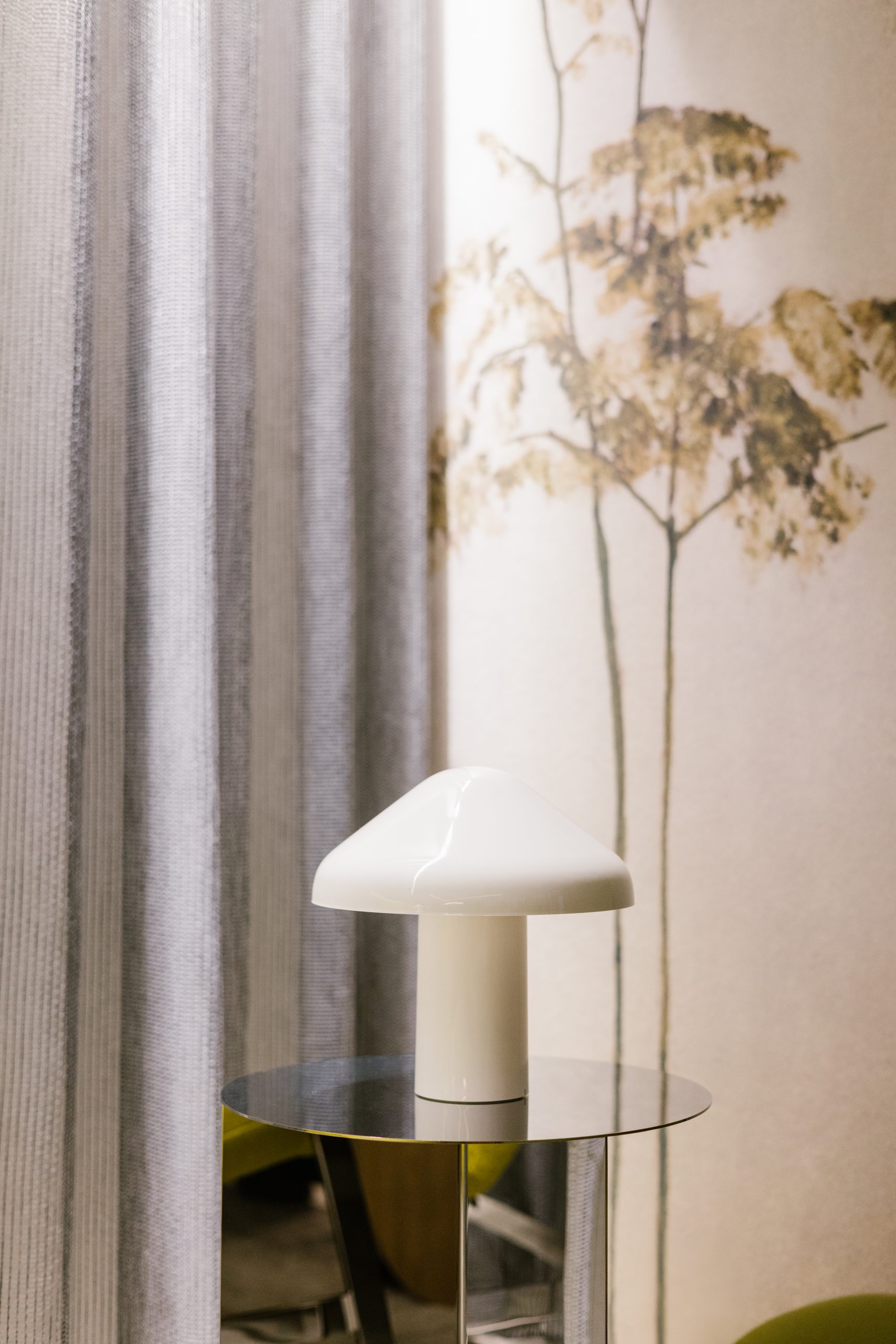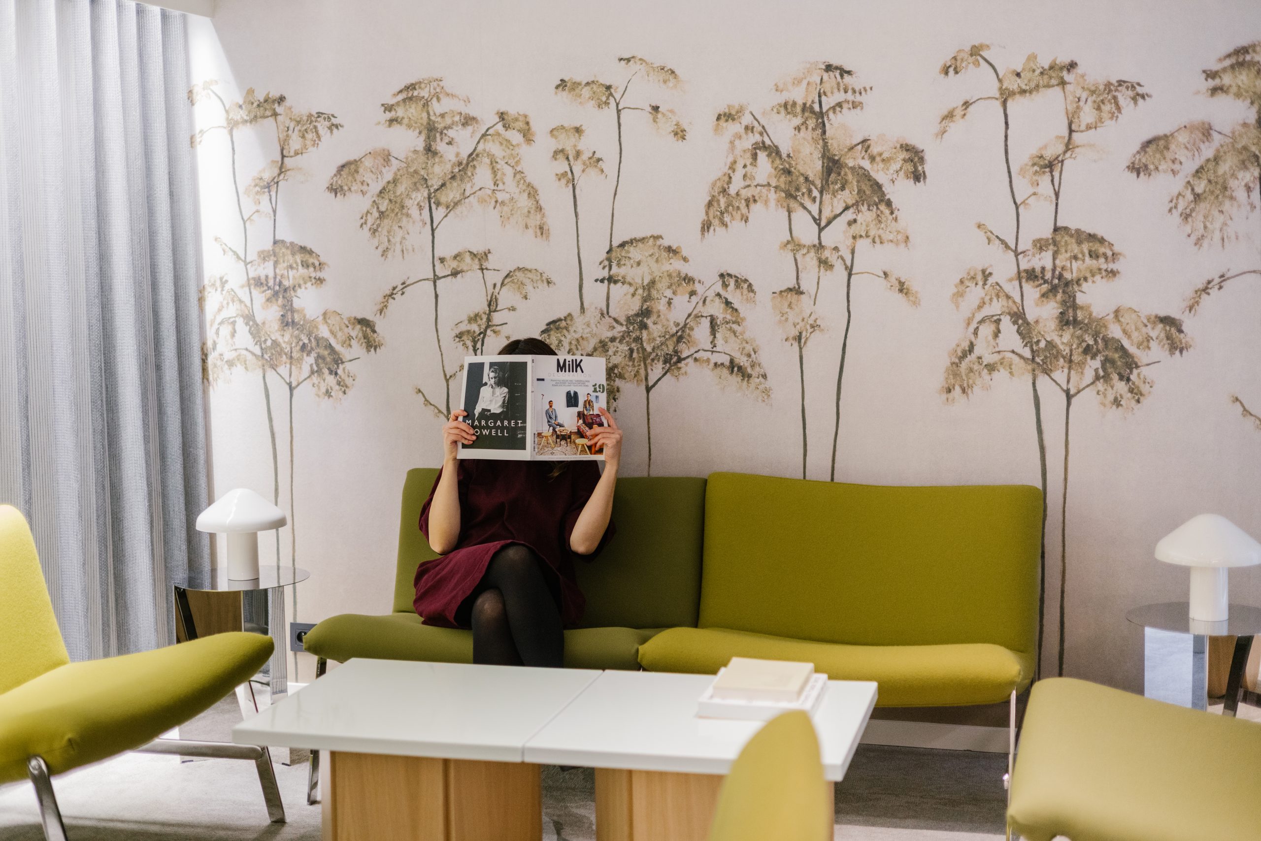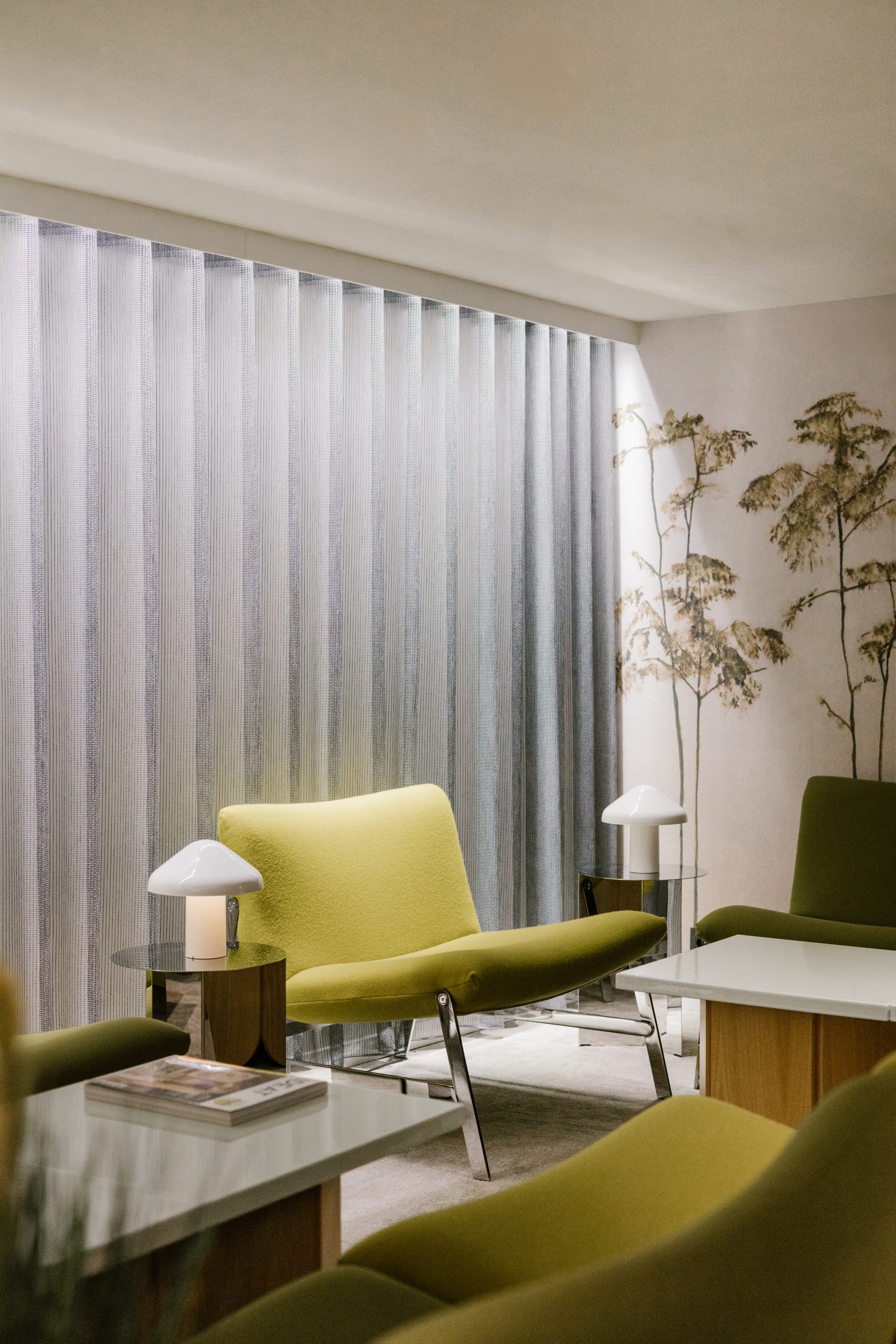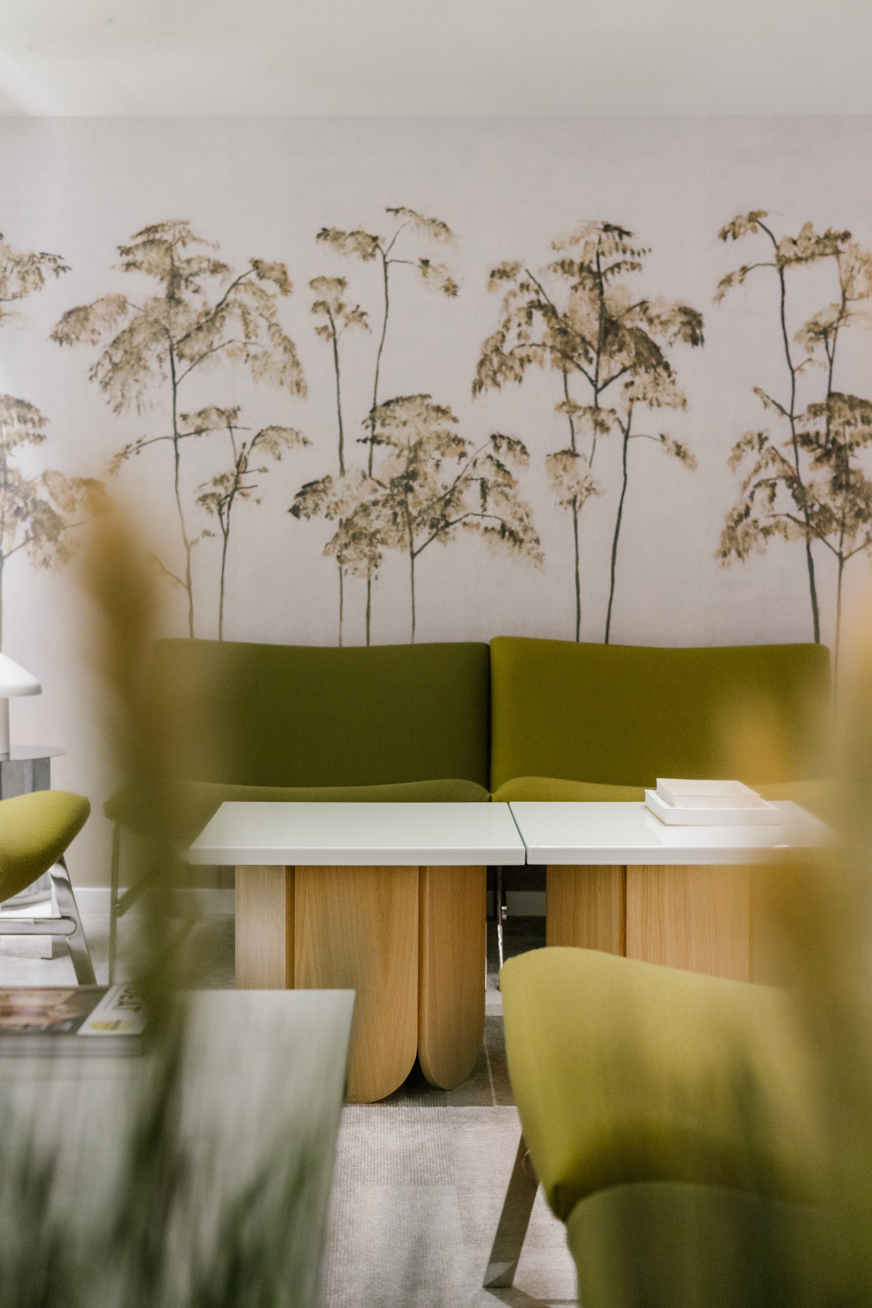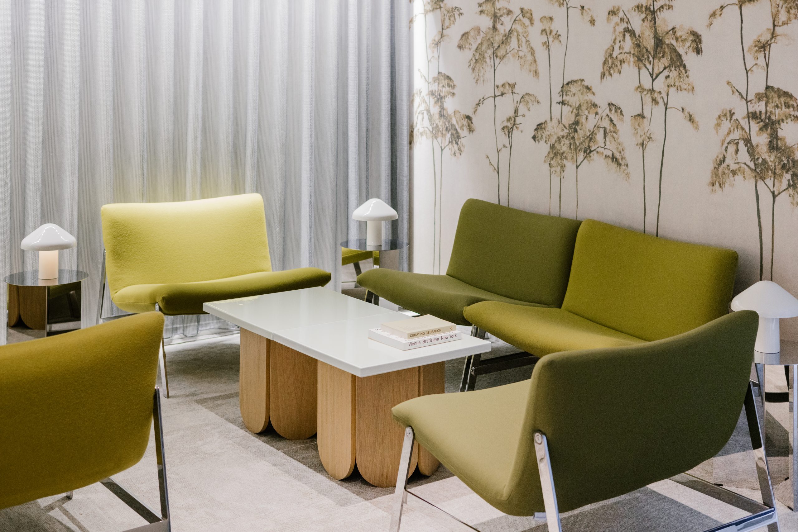 Des fauteuils sans accoudoirs et des tables basses sur mesure peuvent être agencés de différentes manières, offrant ainsi une grande flexibilité d'aménagement. En arrière-plan, un papier peint panoramique naturel enveloppe le salon avec luxuriance.