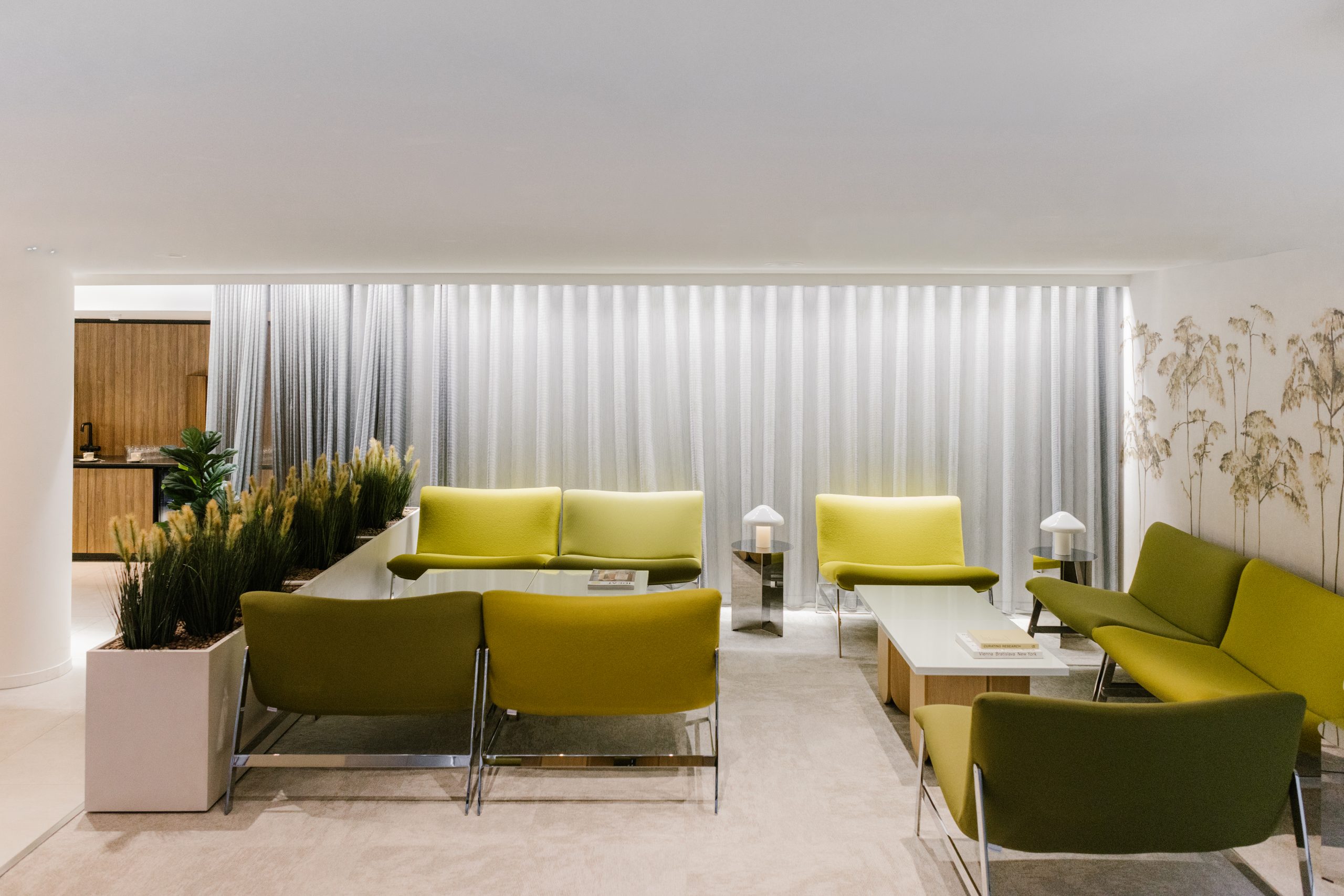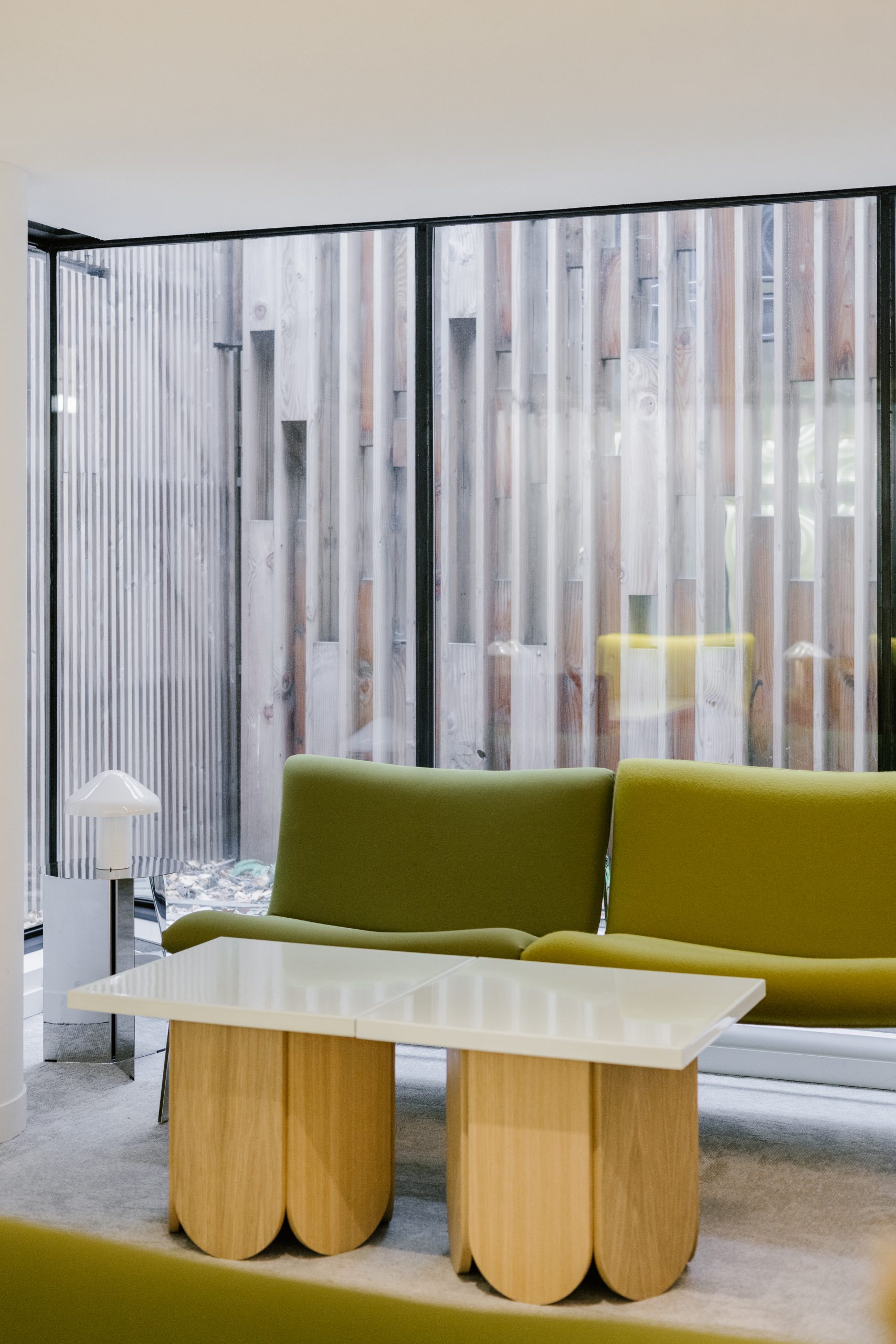 Here the brief was to create a modular and elegant design that could harmoniously fit into the surrounding space and allow for multiple setups while providing a quiet environment for visitors and guests. Our client wanted to inject some colour into the monochrome open space, yet without going too playful or loud, nor creating a contrast with the building’s corporate vibe.